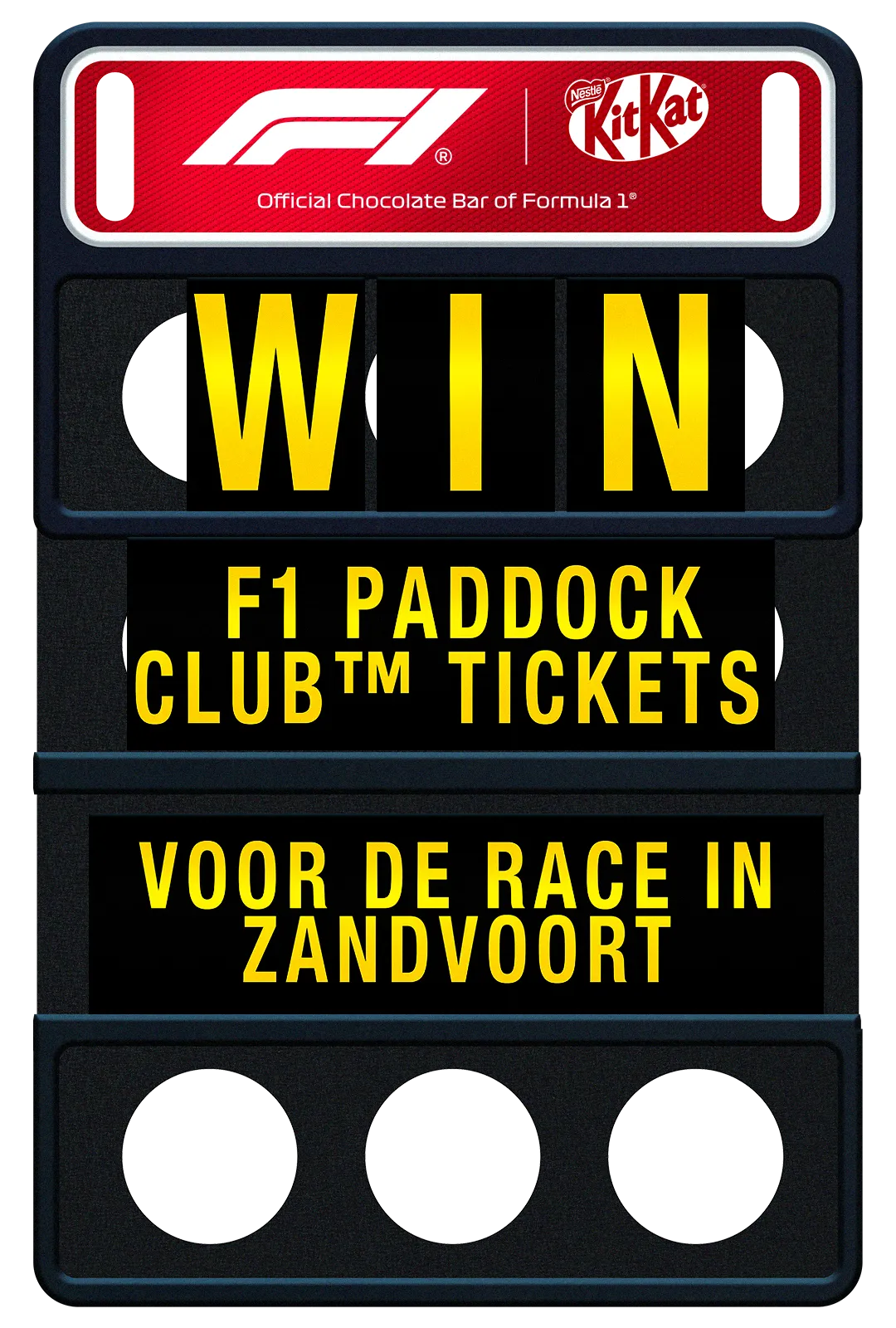 KitKat® promotie 2026: Win F1 PADDOCK CLUB™ TICKETS NAAR DE RACE IN ZANDVOORT (de “Actie”) is van Nestlé Nederland B.V., Stroombaan 14, 1181 VX Amstelveen (Hierna: “Nestlé”) ter promotie van het product/merk KitKat®. De actievoorwaarden (“Actievoorwaarden”) zijn te verkrijgen bij Nestlé Nederland Consumentenservice en zijn tevens te raadplegen op www.kitkat.nl/F1 (“Actiewebsite”).
