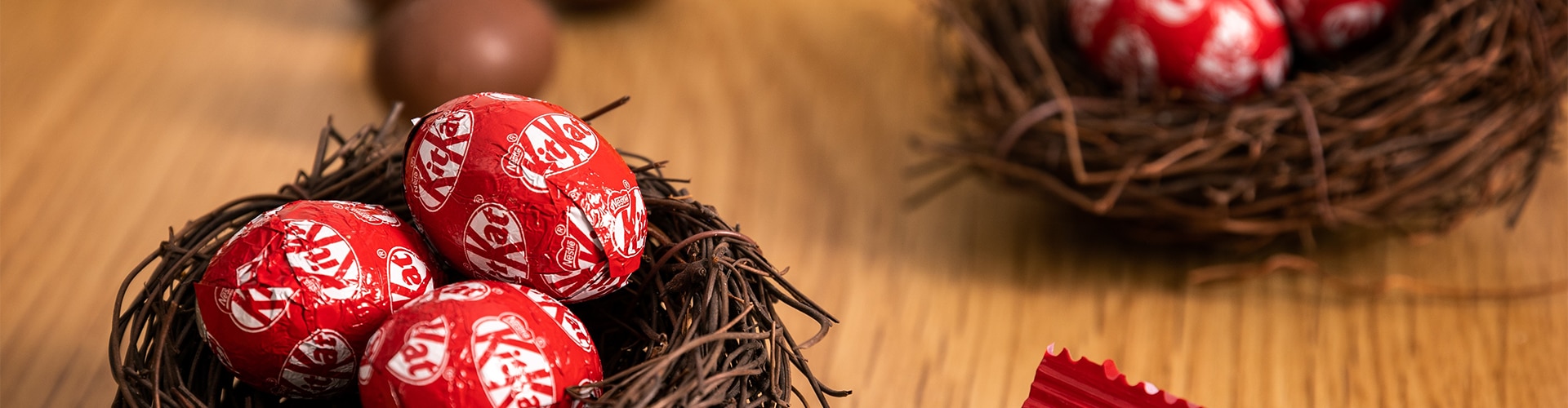 Vroeger had je alleen de keuze uit pure, melk of witte chocolade paaseitjes, tegenwoordig zijn er talloze smaakvariaties. Herken jij tussen de verschillende kleuren jouw favoriete KitKat® smaak? Is een zakje paaseitjes te klein voor jou? Denk dan eens aan een groot luxe paasei. Van holle chocolade, gevuld met bonbons of kleine eitjes, maar altijd prachtig ingepakt. Vrolijk KitKat® Pasen!