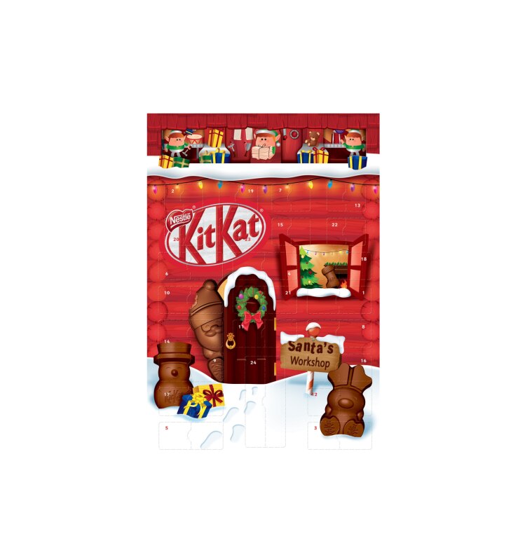 NESTLÉ KITKAT Chocolade Adventskalender bestaat uit 24 mini kerst figuren gemaakt van melk chocolade met een romige vulling met krokante granen- en wafelstukjes. Have a break, have a KitKat.