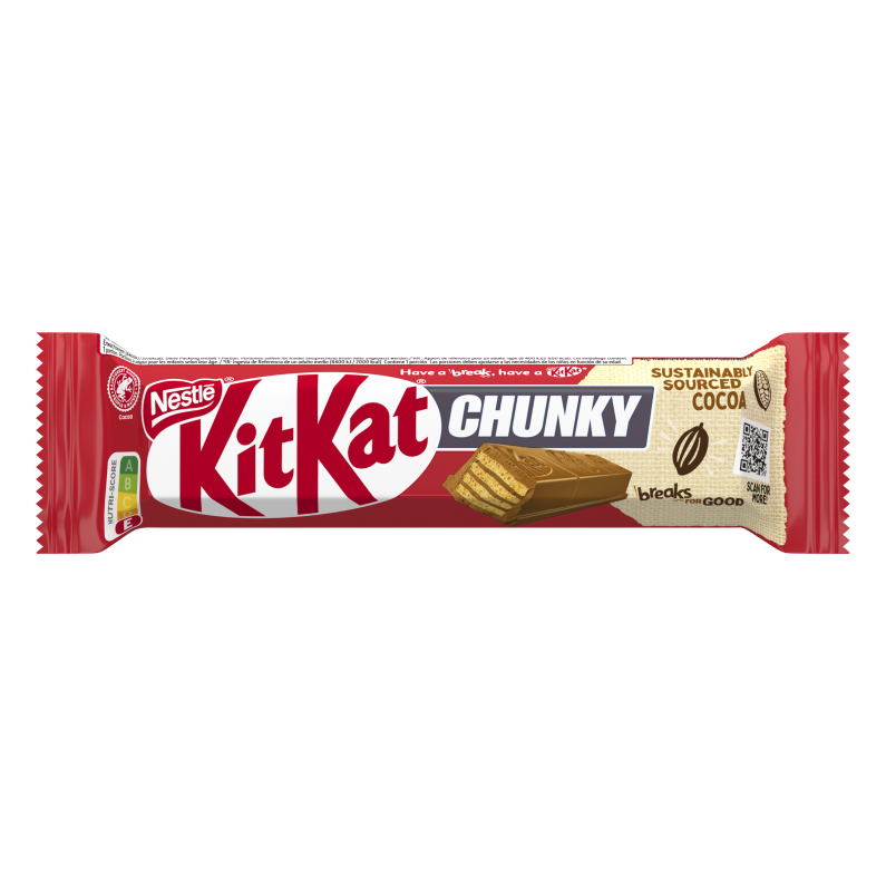 Ingrediënten: Suiker, TARWEmeel, magere MELKpoeder, plantaardige vetten (palm, karité), cacaomassa*, cacaoboter8, watervrij MELKvet, WEIpoeder, magere cacao*, emulgator (lecithinen), rijsmiddel (natriumcarbonaten).