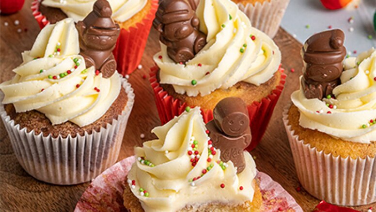 - Decoreer de cupcakes met het glazuur en maak het geheel af met de KitKat® Melkchocolade kerstfiguurtjes.