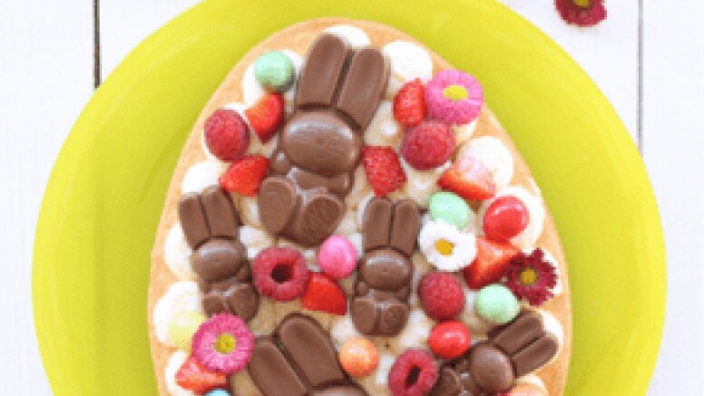 - Versier het ei met de KitKat®-paashazen, aardbeien, frambozen en paaseitjes. Voeg er eventueel nog andere decoratie aan toe.